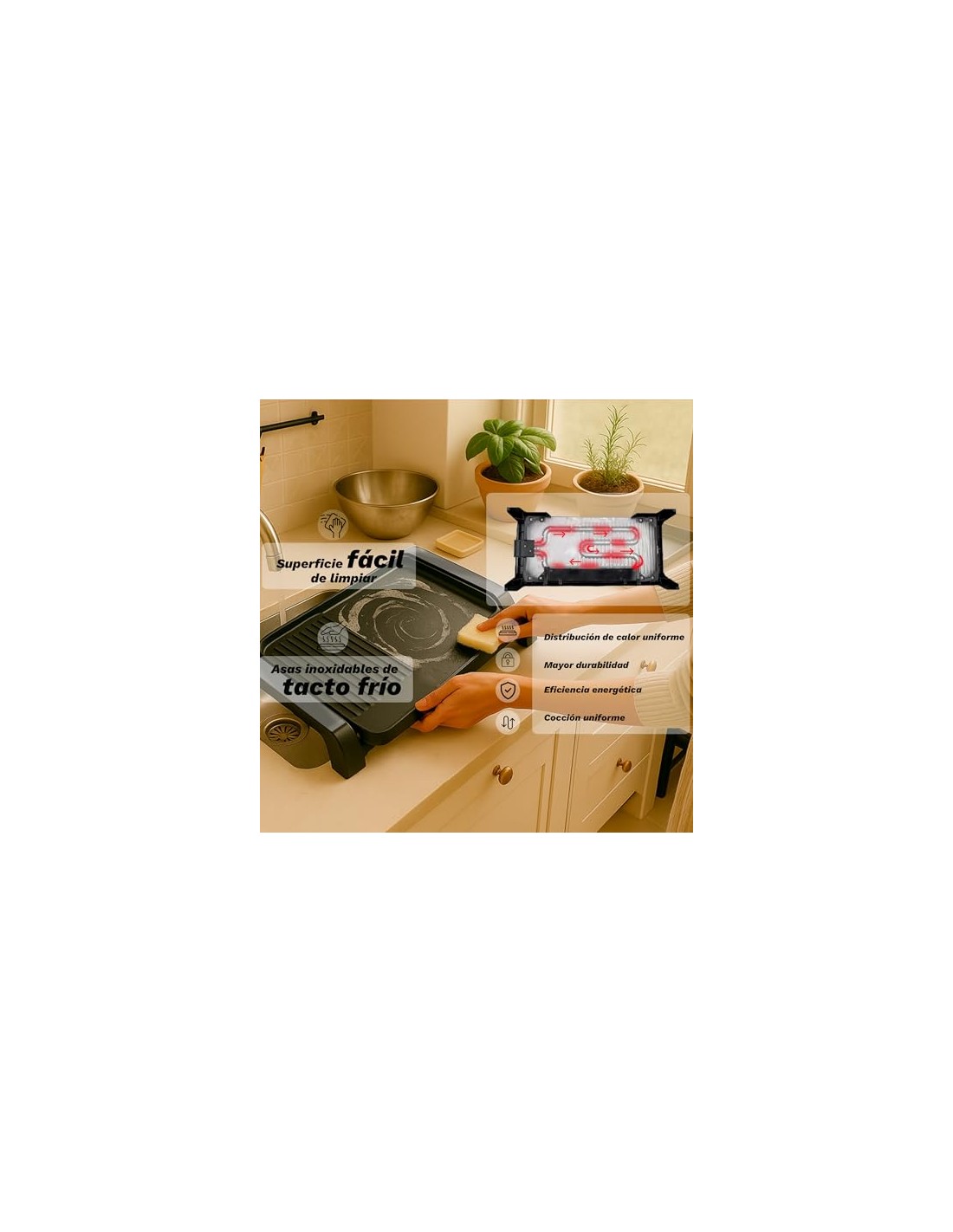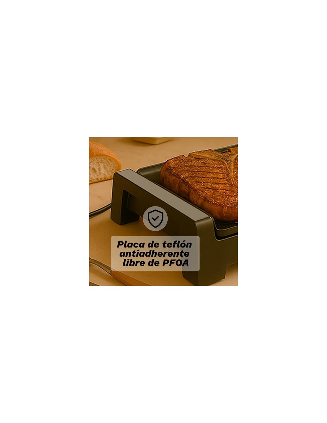 Superficie segura y saludable: Su placa de teflón sin PFOA evita que los alimentos se adhieran y facilita la limpieza, garantizando un uso seguro y saludable.