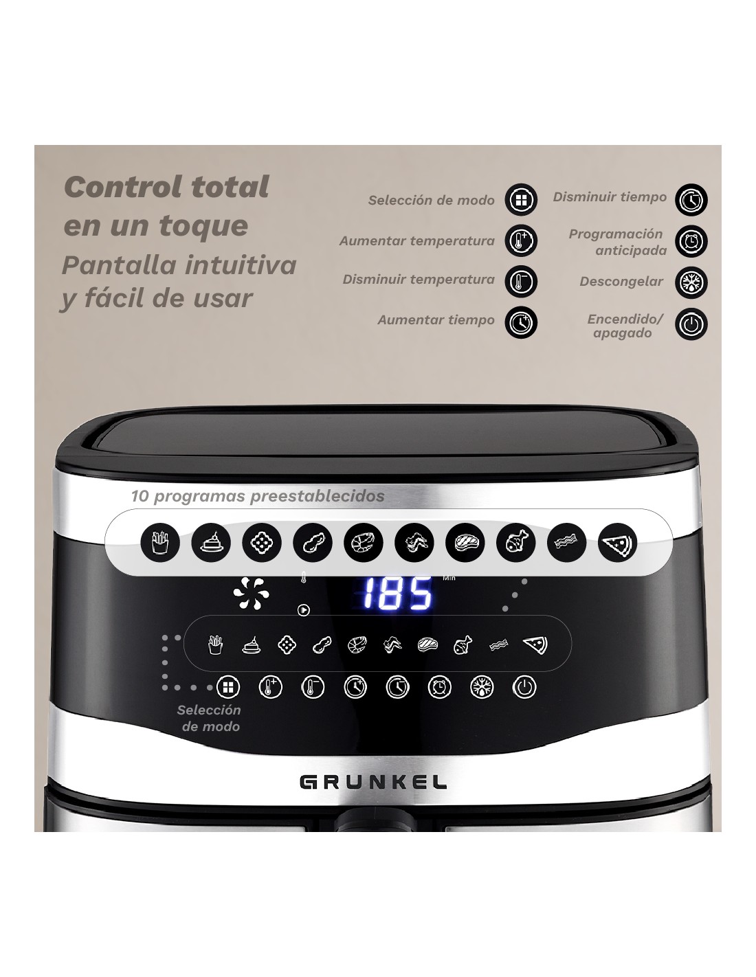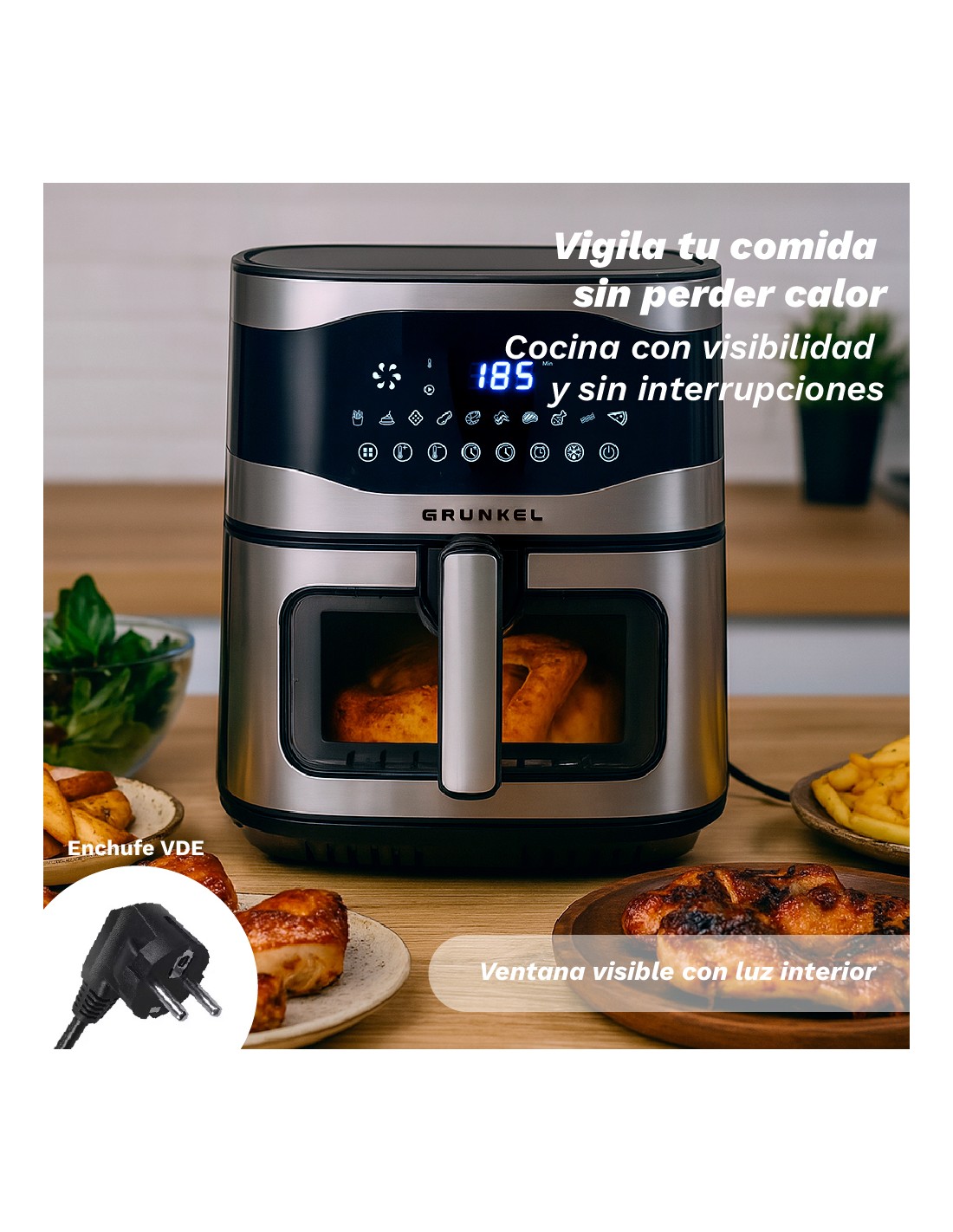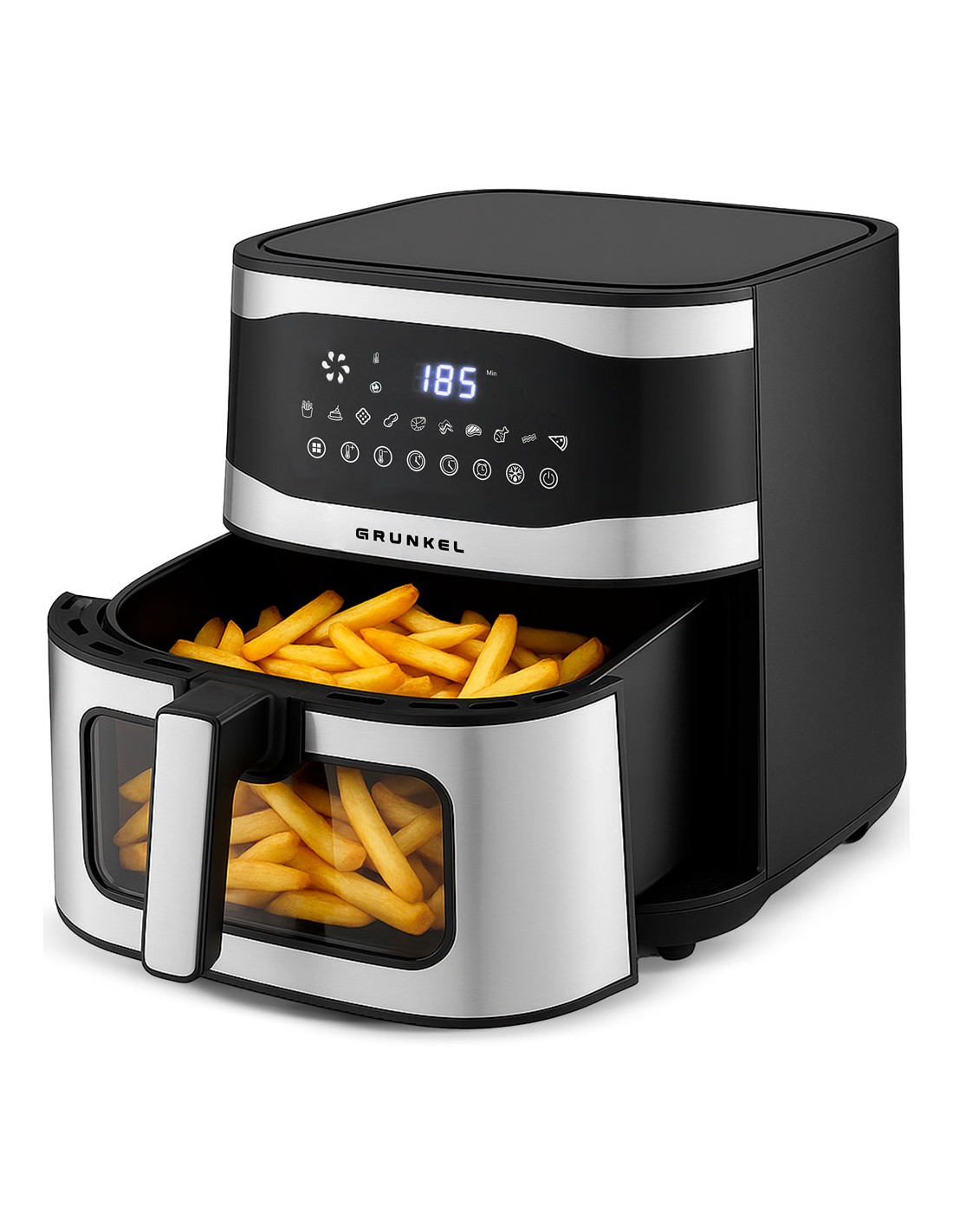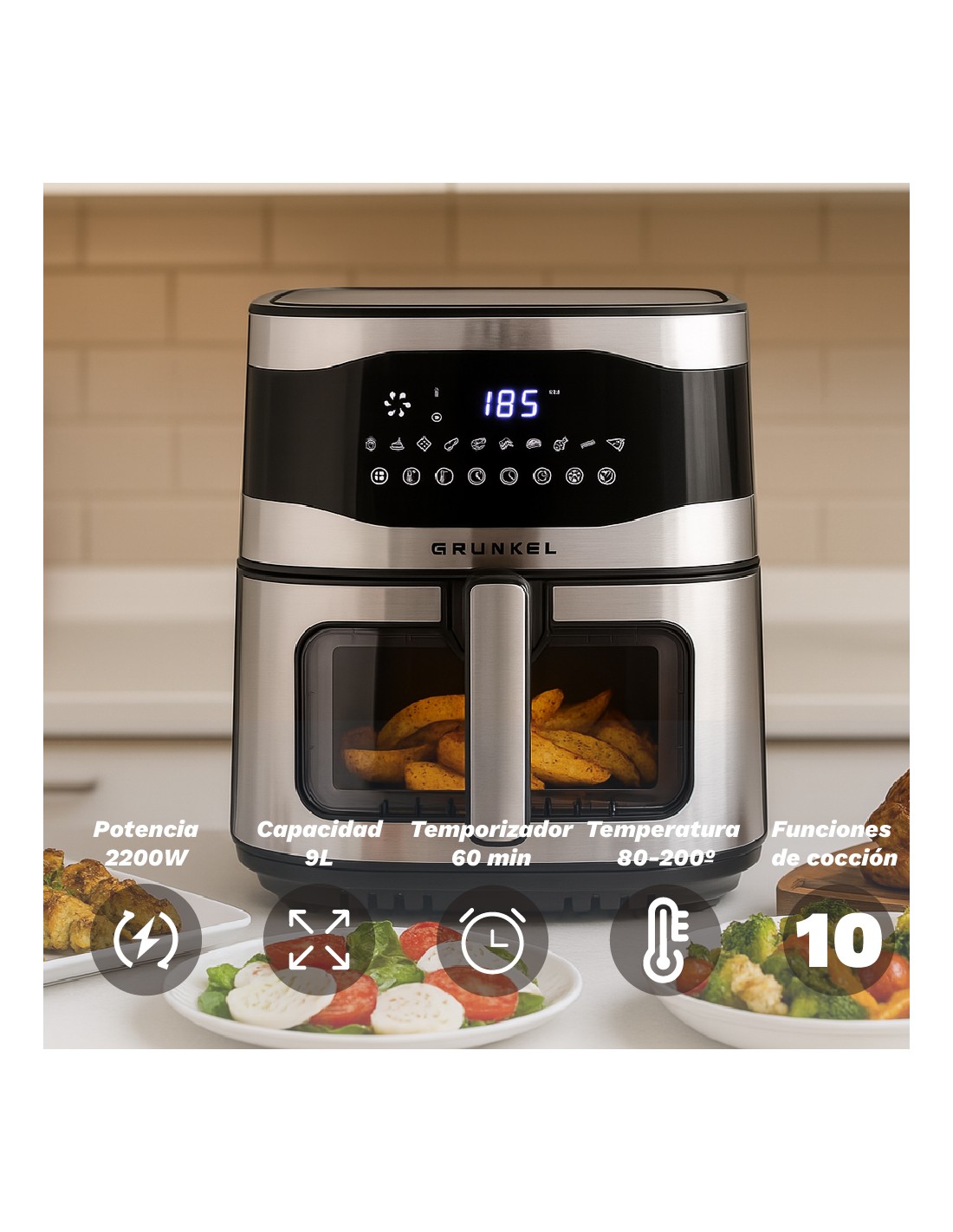 Freidora de aire de GRUNKEL MAXISTEELFRYER, la aliada perfecta para preparar tus recetas favoritas con hasta un 90% menos de grasa. Equipada con 2200W de potencia y resistencias superior e inferior, ofrece una cocción homogénea, eficiente y sin necesidad de girar los alimentos. Su innovadora tecnología Fry Force 360° envuelve tus alimentos en aire caliente para lograr acabados crujientes por fuera y tiernos por dentro. Disfruta de 10 funciones preconfiguradas y temperatura ajustable de 80 a 200 ºC, además de un temporizador de hasta 60 minutos e inicio programable para que tu comida esté lista cuando tú lo estés. Diseñada pensando en la comodidad, incluye ventana visible, olla y rejilla antiadherentes-