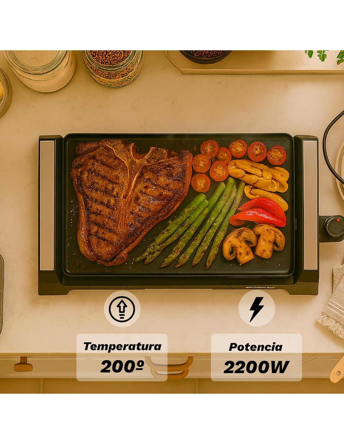 Con su regulador de temperatura ajustable, adapta el calor según el tipo de alimento, permitiendo cocinar carnes, pescados, verduras.