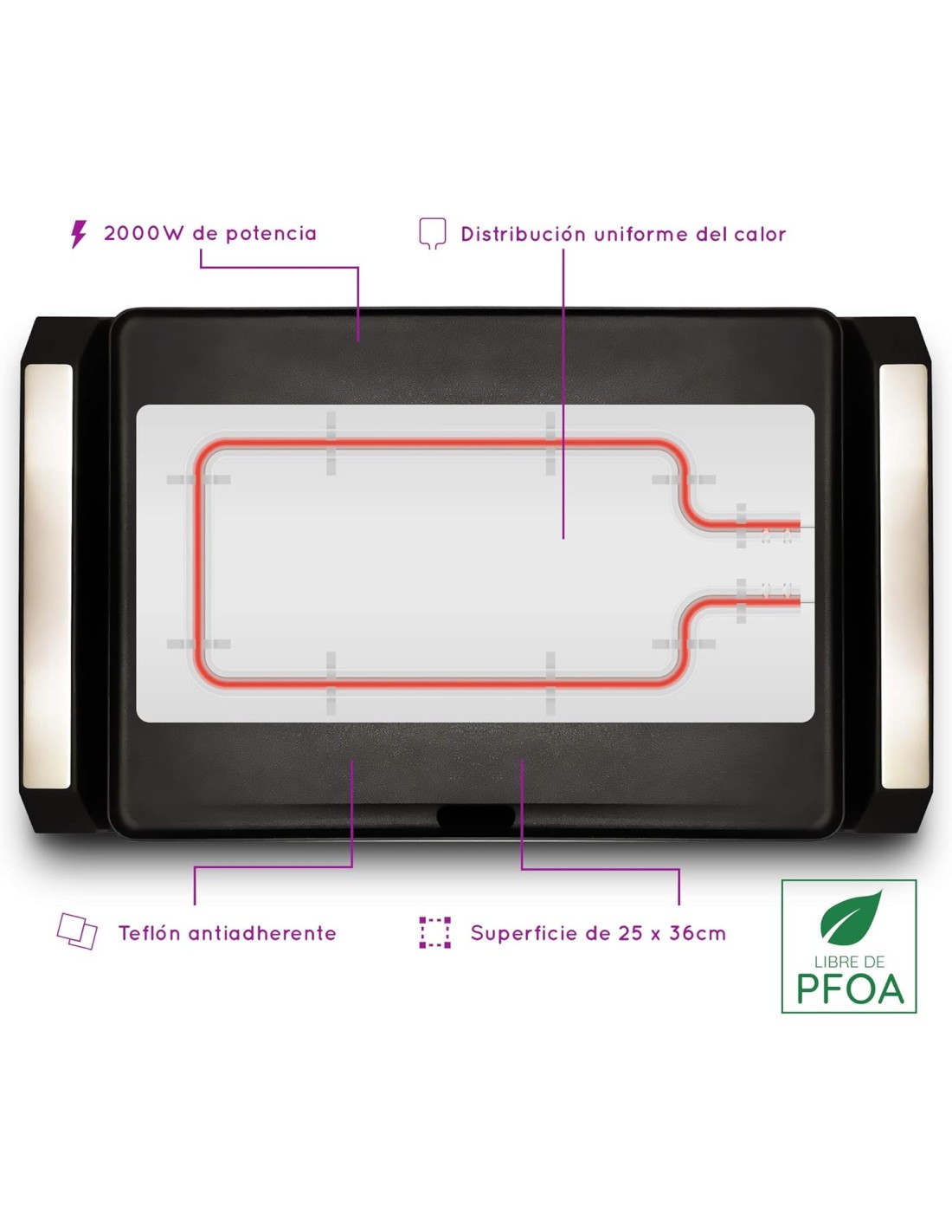 Su superficie segura y saludable gracias a su placa de teflón sin PFOA evita que los alimentos se adhieran y facilita la limpieza, garantizando un uso seguro y saludable.